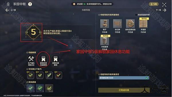 当拓荒者们家园中枢升至五级时,家园则会解锁休息功能,满足休息条件后则会获得五分钟自动恢复生命的增益buff。