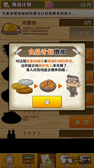 玩家可以用收集的硬币来增加料理的种类,这样就会有新的客人来光顾本店了,相应的客人付的钱也会提升哦。