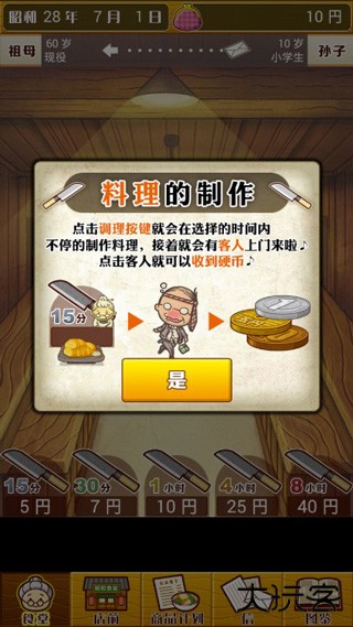 在金币数量允许的情况下,点击下面的“小刀”的经营时间,就会在选择的时间内,不同的制作料理,接着就会有客人上门来消费,点击顾客就可以收到金币了。