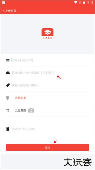 2、取一个跟你资源相匹配的名称,百度云盘的下载链接和提取码,输入购买的金币数量,再输入一些文字介绍之后就可以点击提交了,上传成功就能够在“我的上传”里查看上传记录。