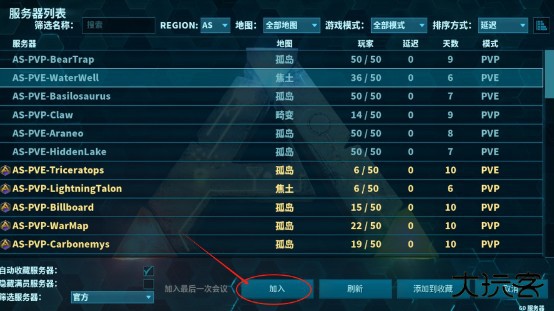 3、返回游戏后,再次点击“加入线上方舟”,你将看到各种由玩家创建的服务器。