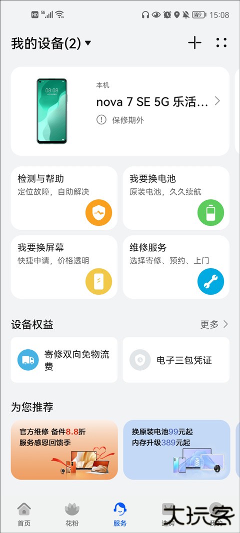 3、进入服务,绑定您的设备,可以为您推荐与设备相关的服务内容,如我要换电池、换屏幕、维修服务等等