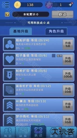 9、跃迁后必点(1、舰船主炮(自动拉BOSS),2、船舱扩容(上阵变成5个人,必点)3、宇宙招聘书(至少可以升到4星)。第二页的角色升级,随便点点力量、攻速、剑术磨练就好了)