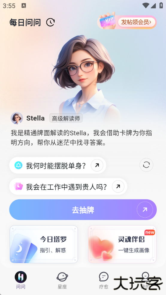 2、智能抽牌对话:通过与AI的互动,进行智能抽牌对话,帮助解决内心的困惑,获得情感上的支持。