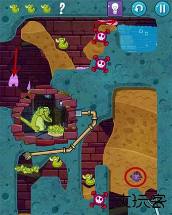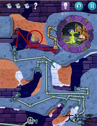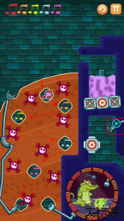 4、第二个关卡就是按正确的顺序把受污染的水导入所有的音符,还要小心作为的炸弹爆炸,同时还要保证小鳄鱼要有水洗澡。