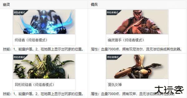 在终结者模式地图中,每回合开局有一名玩家会变成终结者,终结者除去外观上的巨大改变,还有特殊技能。当场上最后的若干名幸存者可以按“E”键变身为佣兵,佣兵可以承受生化幽灵的多次攻击,直到HP损失殆尽。在终结模式中生化幽灵被近身武器杀死的将彻底死亡,无法复活。