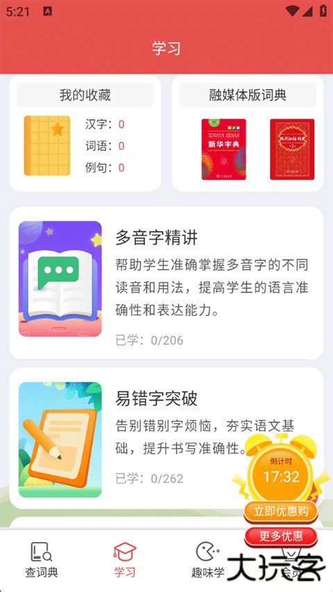 6、点击屏幕下方的学习按钮,在这里有各种如多音字精讲、易错字突破等精品课程,对于刚上学的儿童用户或想查缺补漏的学字用户是非常合适的。