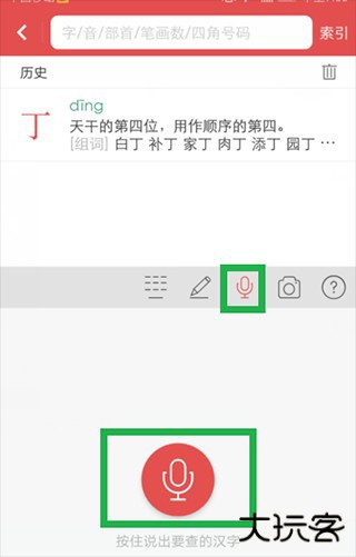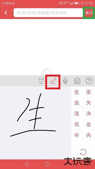 4、若您不知其音,还能点红杆的笔状,将它写入左侧灰幕,格中就会浮出,再点即得知字音了。