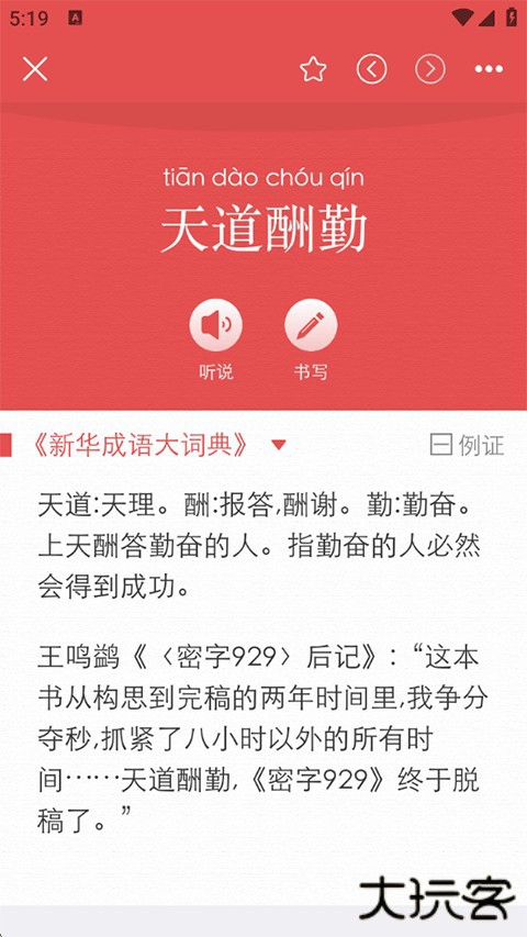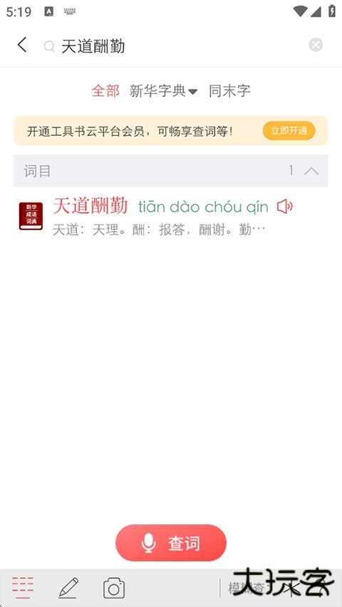 3、点击查词就会显示改成语的读音,释义以及出自来源;