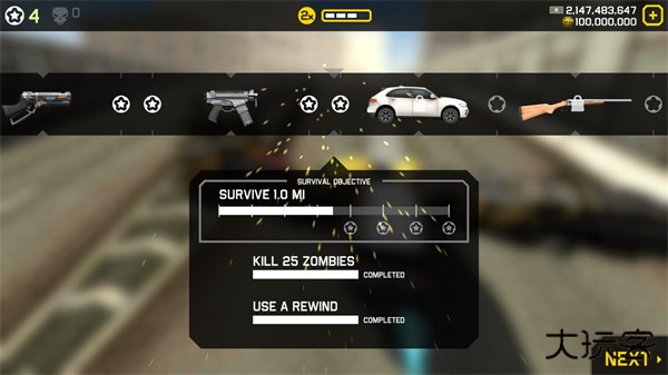 6、在前进过程中会有一些任务可以完成,完成任务后会获得点数,当玩家触碰障碍结束挑战是,这些点数可以解锁不同的武器和车辆。