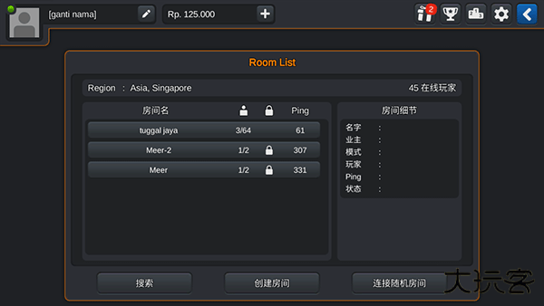 4、在选择好服务器后,你有两个选项:创建自己的房间等待其他玩家加入,或者加入已存在的玩家房间;