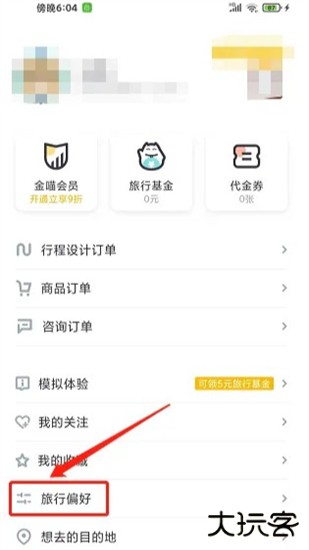 2、在【我的】页面中,找到并点击【旅行偏好】。