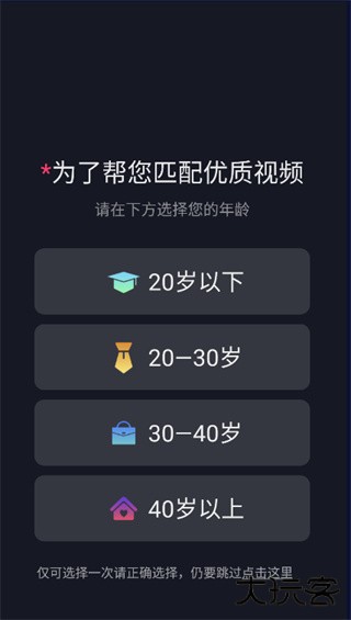 1、下载并安装app,打开后选择 年龄、性别以便匹配优质视频内容。