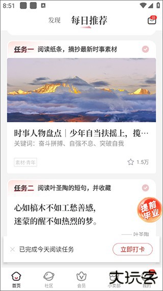 1、在作文纸条素材电子版的主界面上点击顶部“关注”选项;