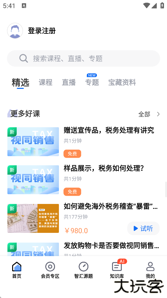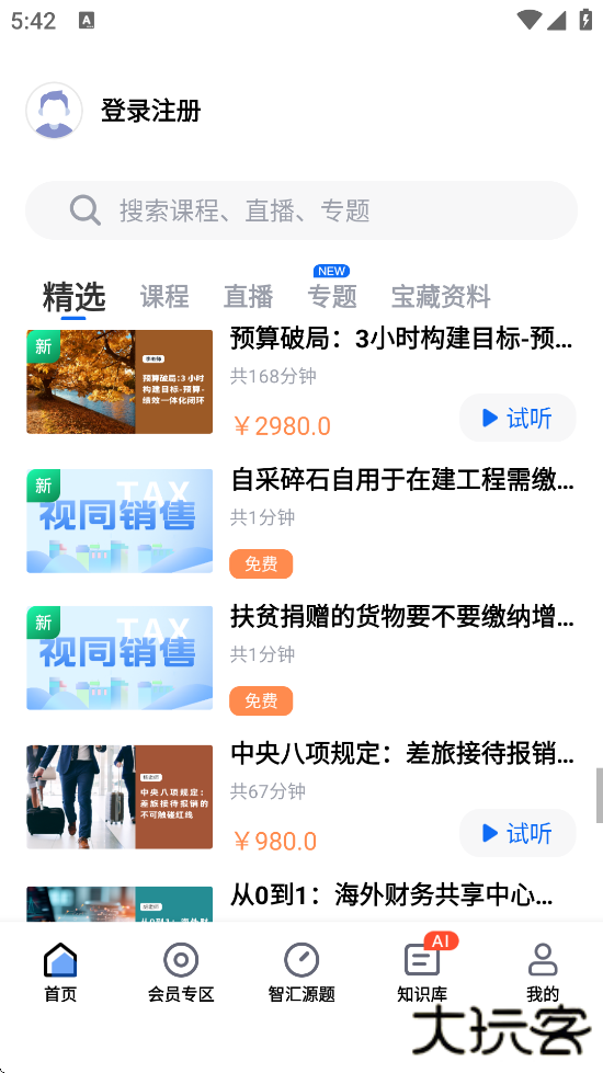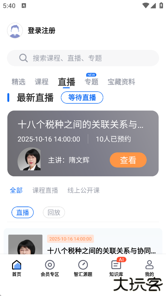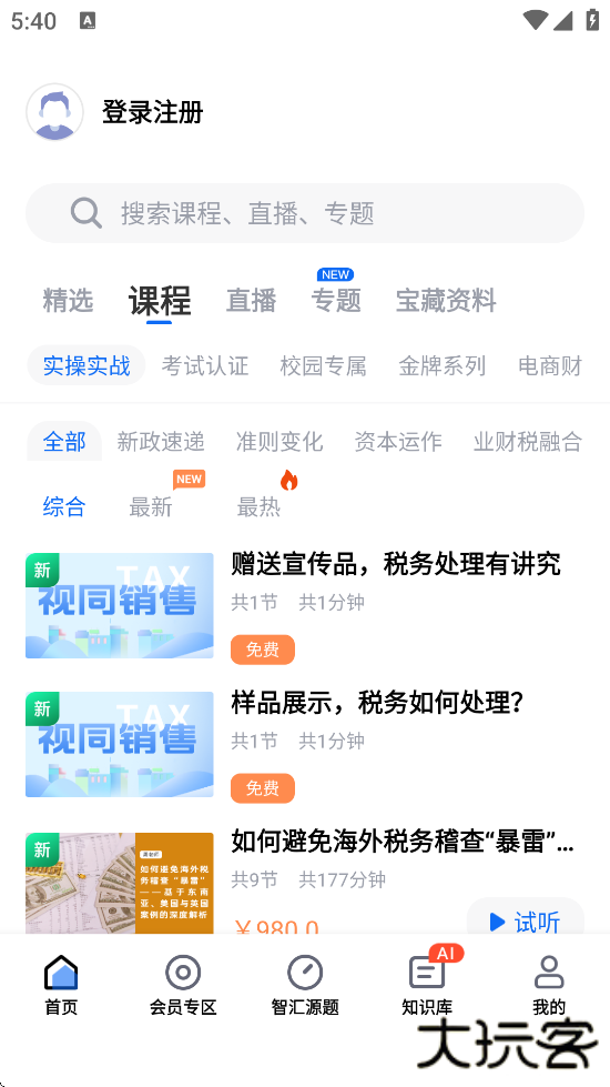 2、课程学习:提供税务管理、财务会计、金融理财等领域的直播课程、录播视频及在线测评,支持用户按需选择学习内容。
