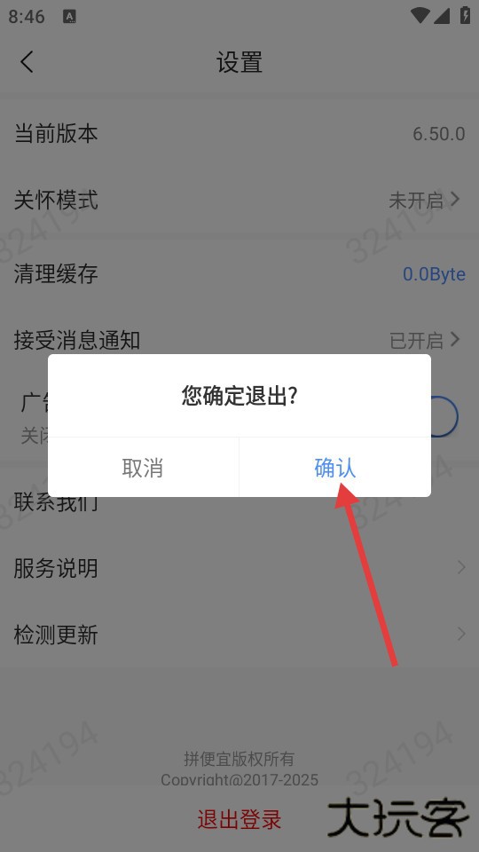 4、在退出确认弹窗中,点击【确认】完成退出登录操作。