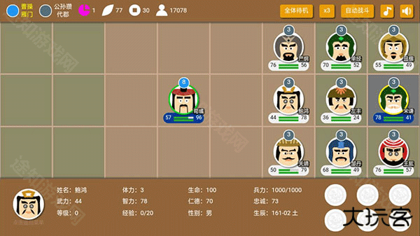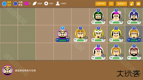 右边武将名字上面的数字分别表示武力和智力,例如曹操武力82智力89