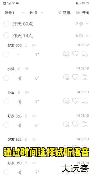 3、通过时间选择试听语音,确认好友后可编辑备注,点击小眼睛图标可进入只看他一人的语音页面。