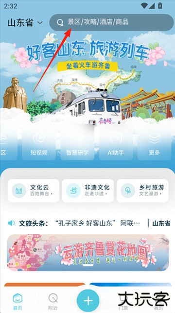 1、打开云游齐鲁首页,可以直接在顶部搜索框搜索景点。