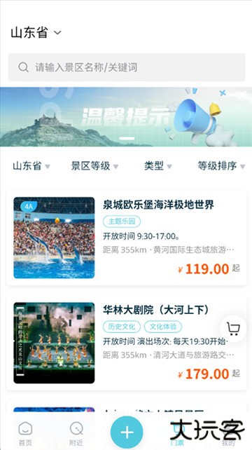 3、在“门票”页面,可以根据山东省内地区、景区等级、类型等条件筛选。