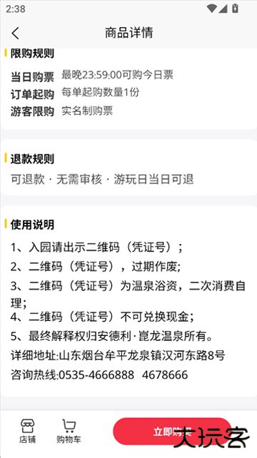 6、查看门票使用说明和退款规则,确认无误后按“立即购买”完成购票。