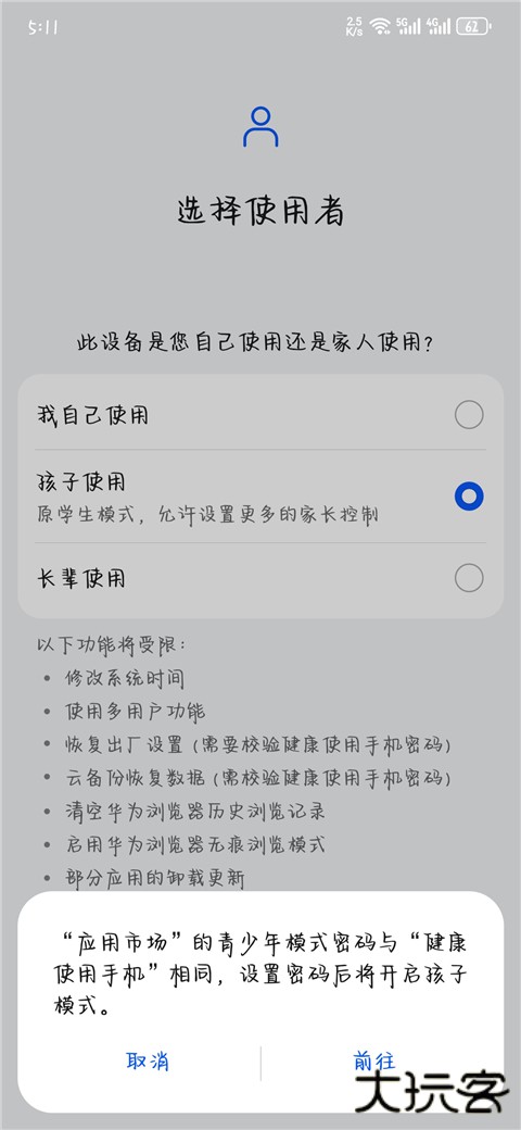 3、随后根据自己的身份选择家长还是设置密码,并设置相应的年龄限制。