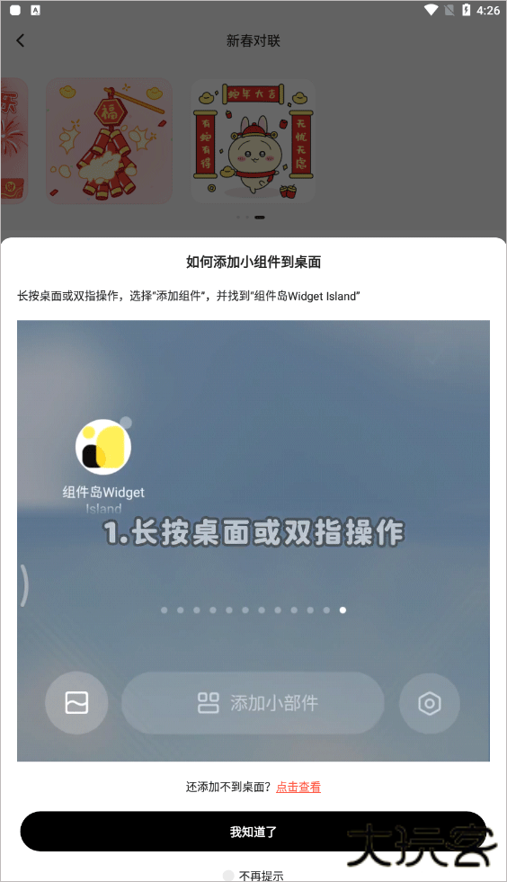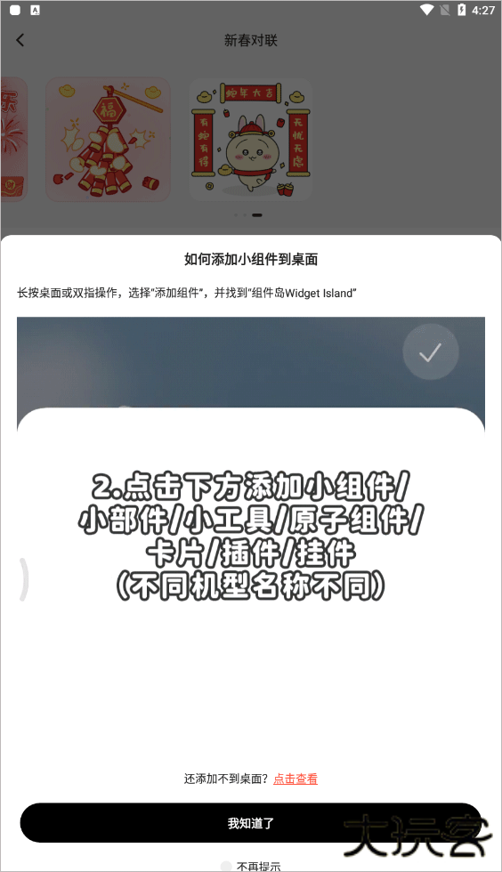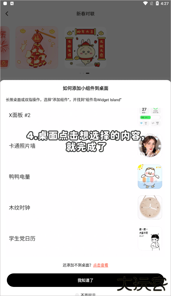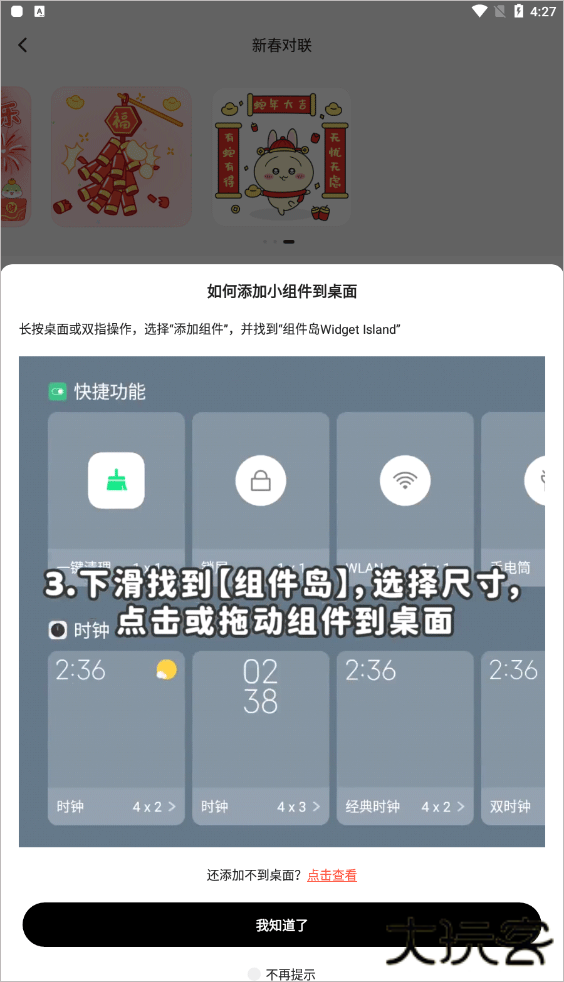 3、选择对应的小组件尺寸,然后点击或拖动小组件到桌面,即可完成桌面安装