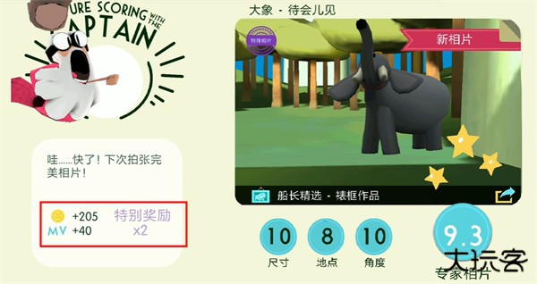移动镜头,点击拍摄,就可以得到一张照片了,当胶卷用完后就可以结束进入照片的评定界面,只要角度好、尺寸好,就可以得到很高的分数啦。