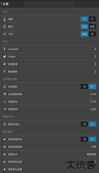 3、设置栏里包含了许多信息,常见的就是温度、距离和气压,其次在这里你还可以选择新浪微博、腾讯微博进行账号登录。在插件功能里,还有时钟动画开关、动态效果选择,背景显示以及其他的一些个人偏好设置,具体用户可根据自己的习惯进行操作。