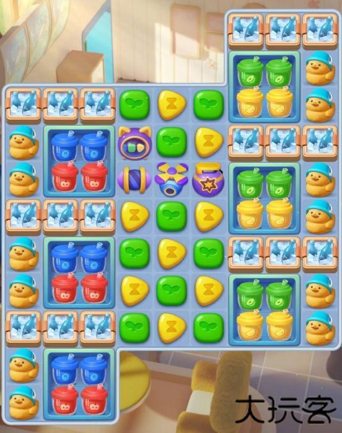 529关比之前面更加麻烦,鸭子被框在最外层触碰不到,而鸭子消除完还有大片沙地需要处理。本关优先使用的依然是“炸弹”,无论是“炸弹+螺旋桨”还是“炸弹+火箭”效果都很好,如果合出“超级智脑”则尽可能配出“螺旋桨+炸弹”,要尽快用更少的步数将汽水箱和冰桶炸掉,最后集中处理鸭子与沙地即可。
