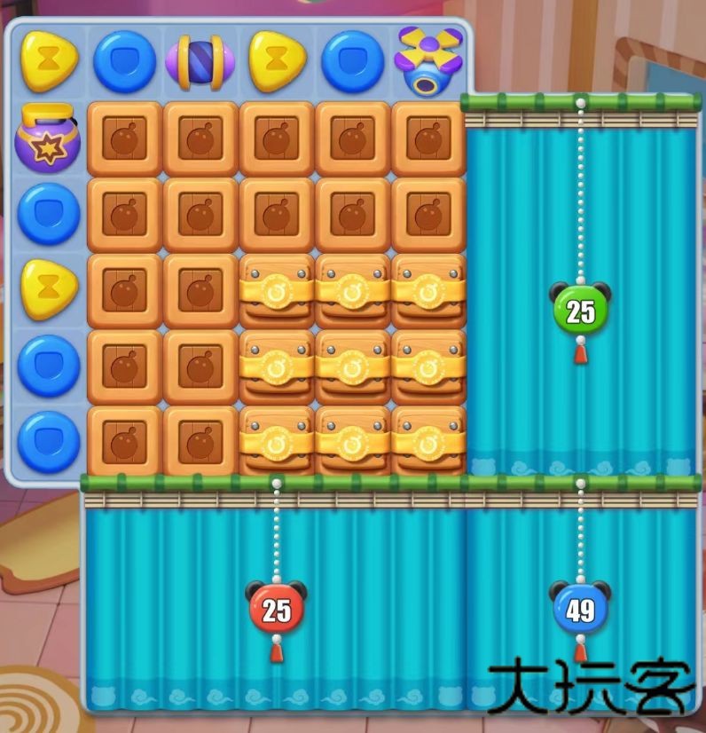 519关同样容易在开图中消耗过多步数,所以一定要优先打掉木箱扩大地盘,有条件可以开局带个炸弹进去。不管是开帘子前收集棋子还是开帘子后定点消除,要多用“炸弹+螺旋桨”可以轻易解决大部分机关,或者选择效率更低一点的“超级智脑+火箭”,但是后者一定要在开了足够多的棋盘之后,否则效果实在是不尽人意。