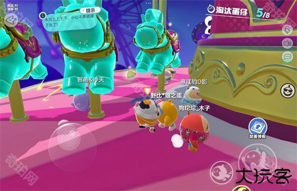 “旋转木马”看似美好梦幻,实则是惊险木马!作为一个生存关卡,难度不容小觑。这一关卡旋转木马不再是童年里的悠闲舒适的坐骑了,而是升降不停,触碰到就会被弹开的障碍物。玩家需要在狭窄的,无时无刻转动的空间中生存下来,不仅仅要注意毫无规律的木马的撞击,还要警惕其他玩家留下的地雷炸弹或者其他玩家的云雾弹,咸鱼攻击等等。想要生存下来,玩家就要做好充足准备,获取关卡里的各种道具,与其他玩家,与狡猾木马斗智斗勇吧!