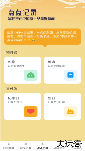 首页→进入【点点记录】→点击右下角“+”→填写购物清单/纪念日等→保存至对应分类。
