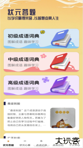 进入首页→点击【状元答题】→选择初级/中级/高级成语词典入口。