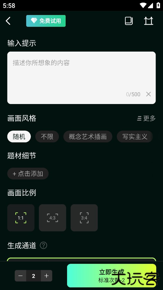 在首页上半部分,你可以清晰地看到各种功能按钮。为了快速上手,我们可以点击“立即尝试”按钮作为起点,开始你的艺术创作之旅。