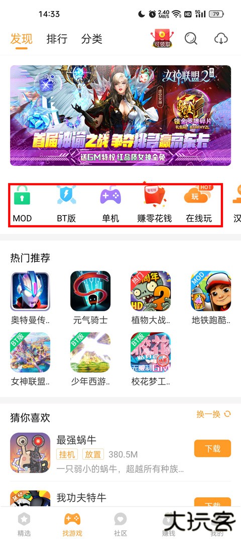2、点击下方“找游戏”板块,可浏览MOD、在线玩、单机、网游等多种游戏类型,还有平台推荐的精品游戏。