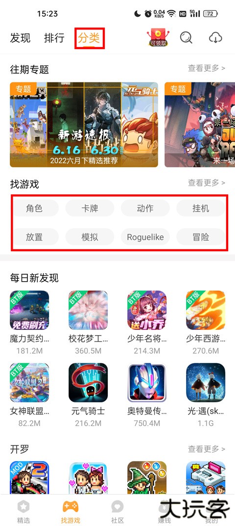 4、若排行榜不能满足需求,可点击“分类”,这里涵盖角色、卡牌、动作、放置、模拟等多种经典游戏类型。