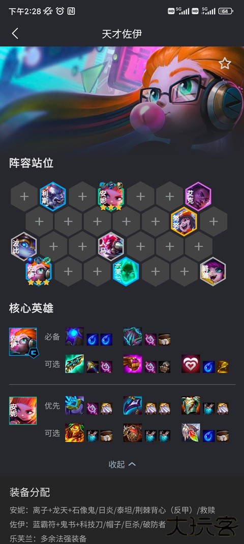 2、在详情页面内可以看到阵容的阵容站位、核心英雄、准备分配、当前羁绊效果、强化符文推荐等等内容