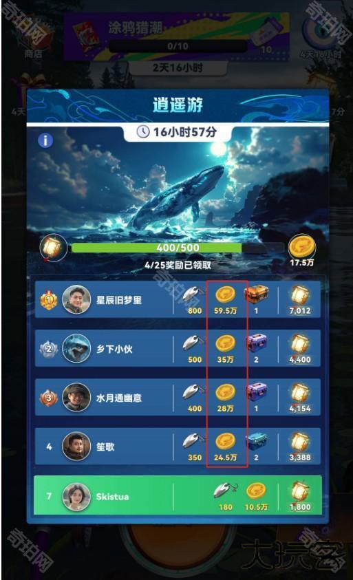 排行榜的进度奖励:捕获北冥钓场限定鱼类,获取排行榜积分,以获得更多金币奖励。