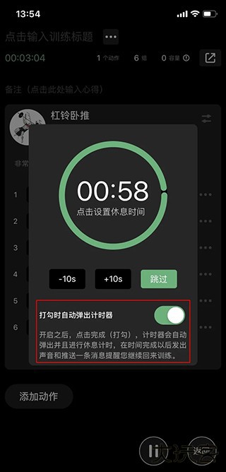 3、如果你希望在打勾完成训练的同时自动开始休息计时,可以在计时面板中打开“自动开始休息计时”选项。这样,每次勾选完组数后,系统会自动开始记录你的休息时间。