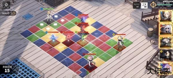 通过控制谱面上的角色通过相同的色块,角色可选择的前进方向是周围八个格子中的任意一个格子,当你通过的色块附近有敌方单位时,和格子底色相同属性的角色将对于敌人造成格子倍率*白字的伤害。 同时队长可以豁免格子底色判定,是否同属性都将对于敌人造成伤害。