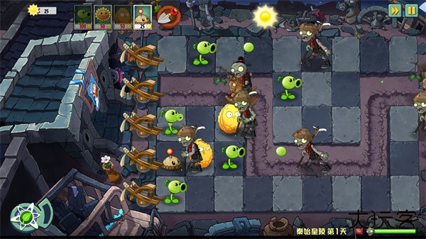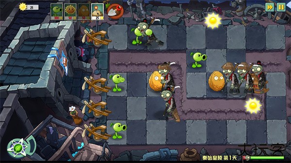 2. 快速收集阳光,在前方布置豌豆射手和坚果,后方则可以种植向日葵。