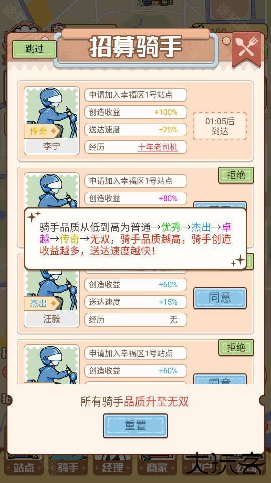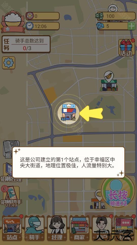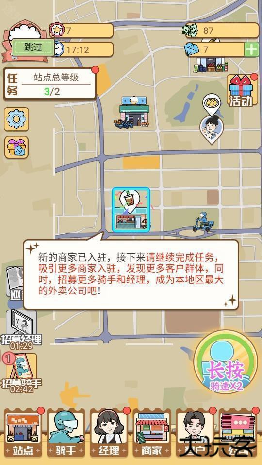 1、开拓站点,解锁城市内各区版图,建设站点,将外卖站点开遍全市。