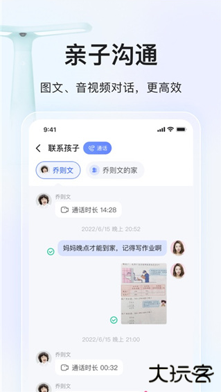 3、支持音视频通话、文字/图片消息发送,家长可实时查看孩子学习状态,并通过“点赞”功能激励孩子。