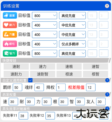 a.目标值:填写正常能达到的数值,一般不要填超过800,并且如果不想训练的项可以填低。你可以将它理解为训练倾向。