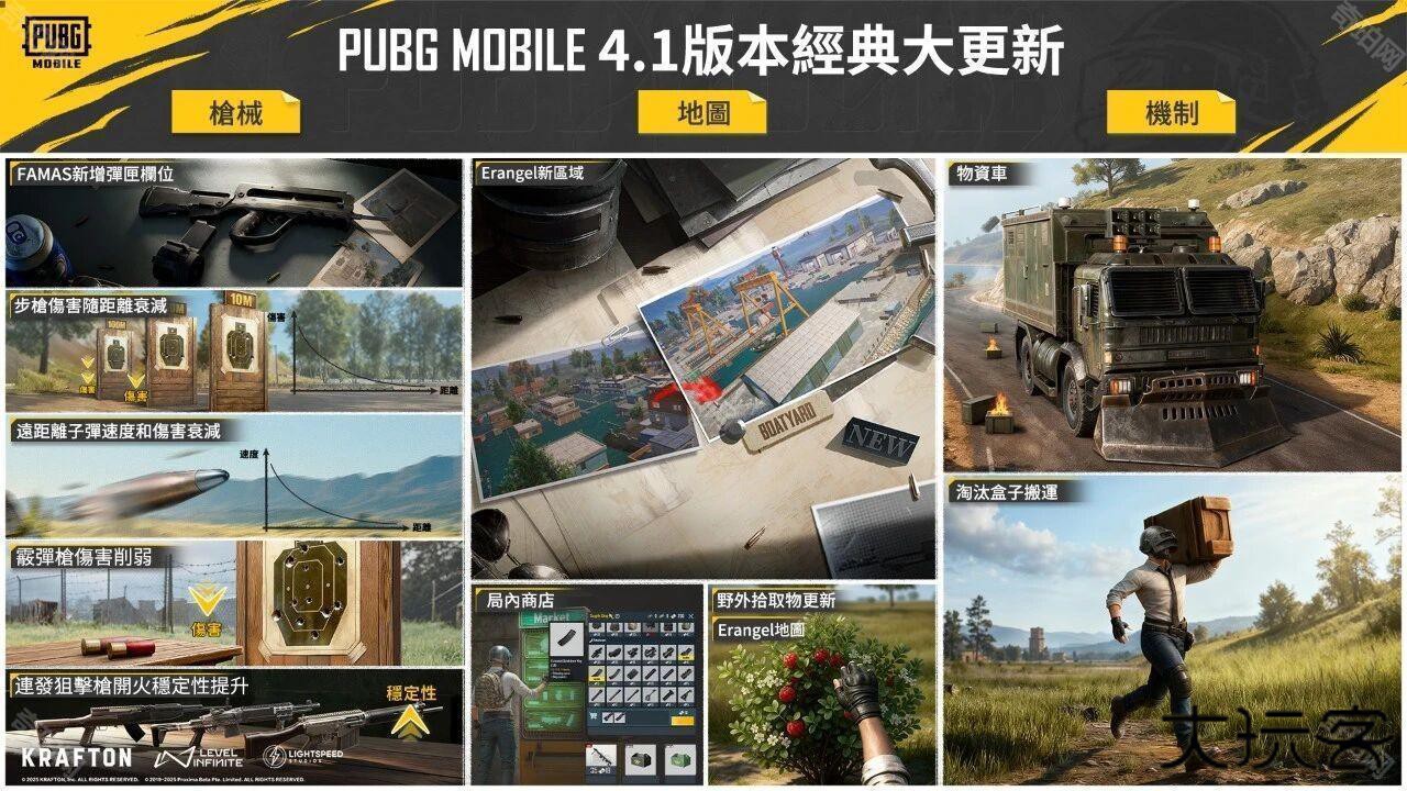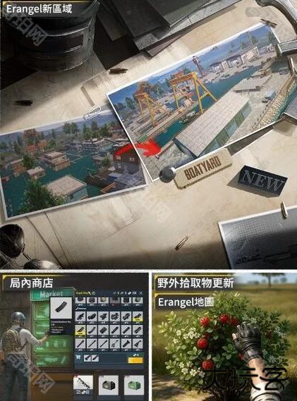 3、物资与地图:新增物资车环线移动(攻击掉落物资/摧毁开启宝箱),淘汰盒子支援搬运;局内商店奖励更新(高级械礼盒、复活礼盒);Erangel新增Boatyard港口区域,更有能量果实加入,焕发新活力!