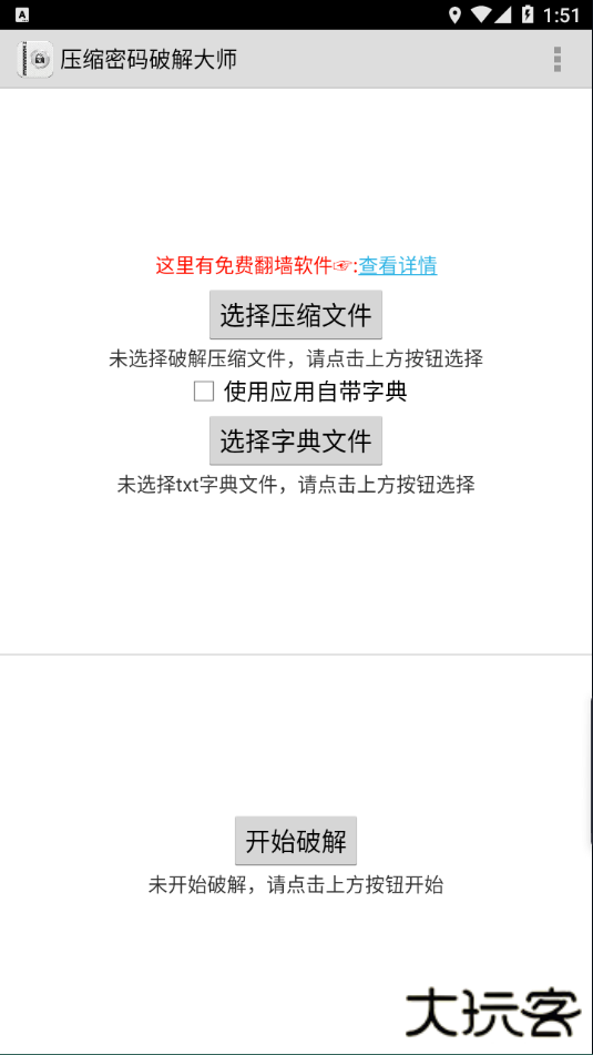 二、点击字典暴力破解,选择需要破解的压缩文件与是否使用应用自带字典;