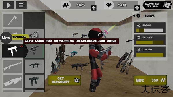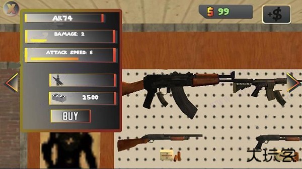 6、查看武器名称 / 伤害值 / 攻速 / 载弹量 / 售价(如 AK74 售价 $2500)。