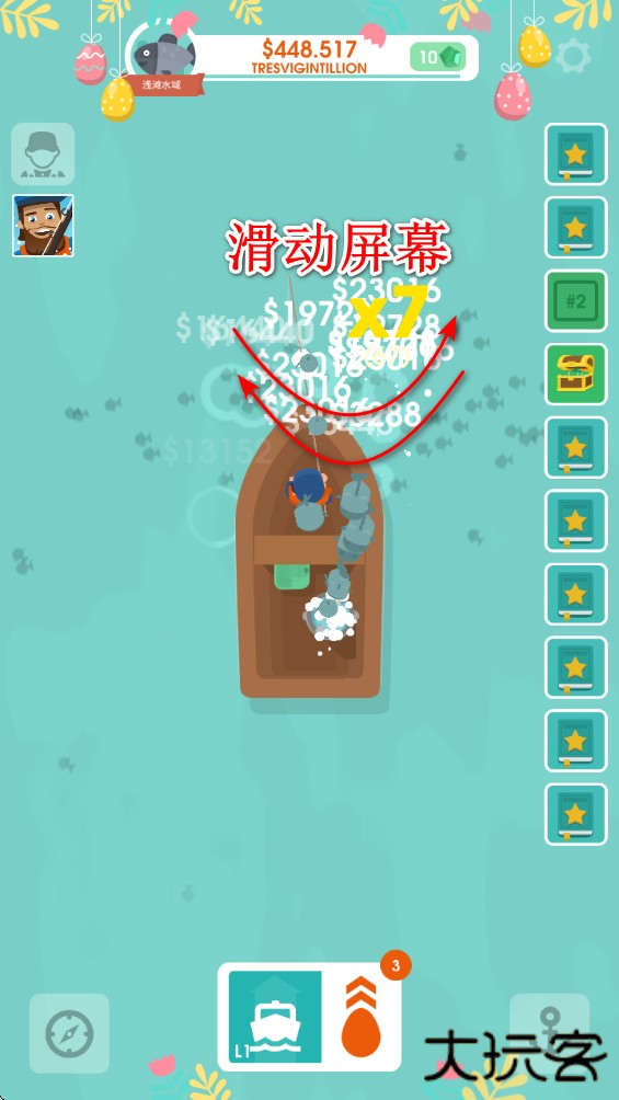 3.鱼咬钩后,迅速在屏幕上左右滑动。 尽量保持滑动强度,防止鱼逃脱。