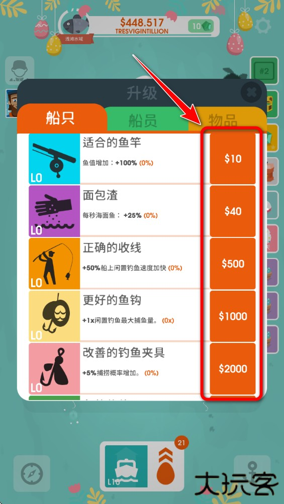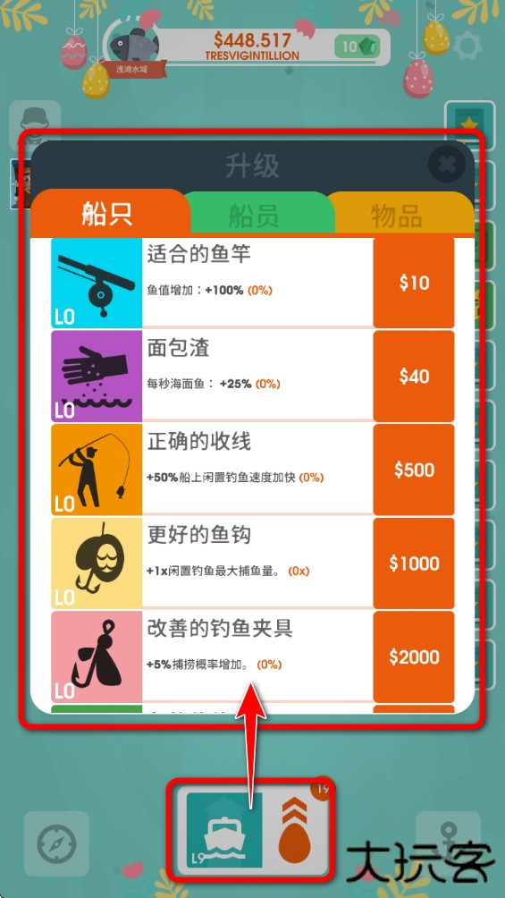 2、选取需要的升级项目。 例如鱼竿、鱼饵(如面包渣)、收线器等,点击选项进行强化。